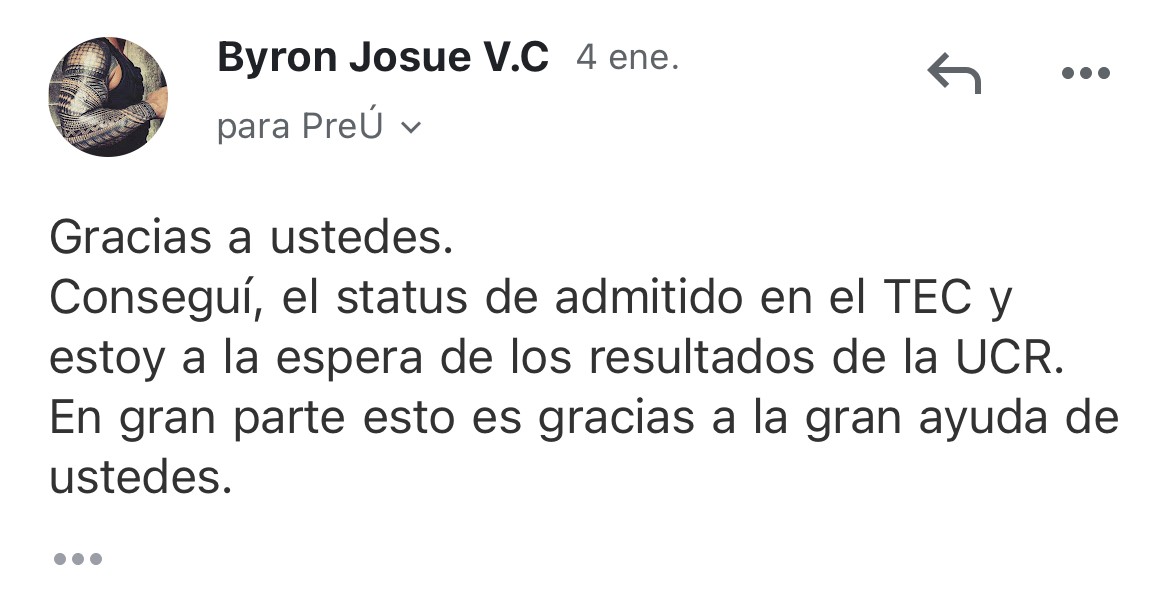 Gracias a ustedes. Conseguí el status de admitido en el TEC y estoy a la espera de los resultados de la UCR. En gran parte esto es gracias a la gran ayuda de ustedes.