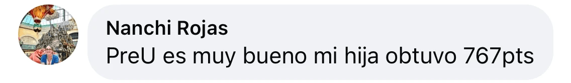 Pre U fue para mí un enorme apoyo en mi objetivo de lograr una nota que me permitiera alcanzar mis sueños de admisión Universitaria las clases, material y pruebas son sin duda excelentes, generando a parte de conocimiento también una gran confianza